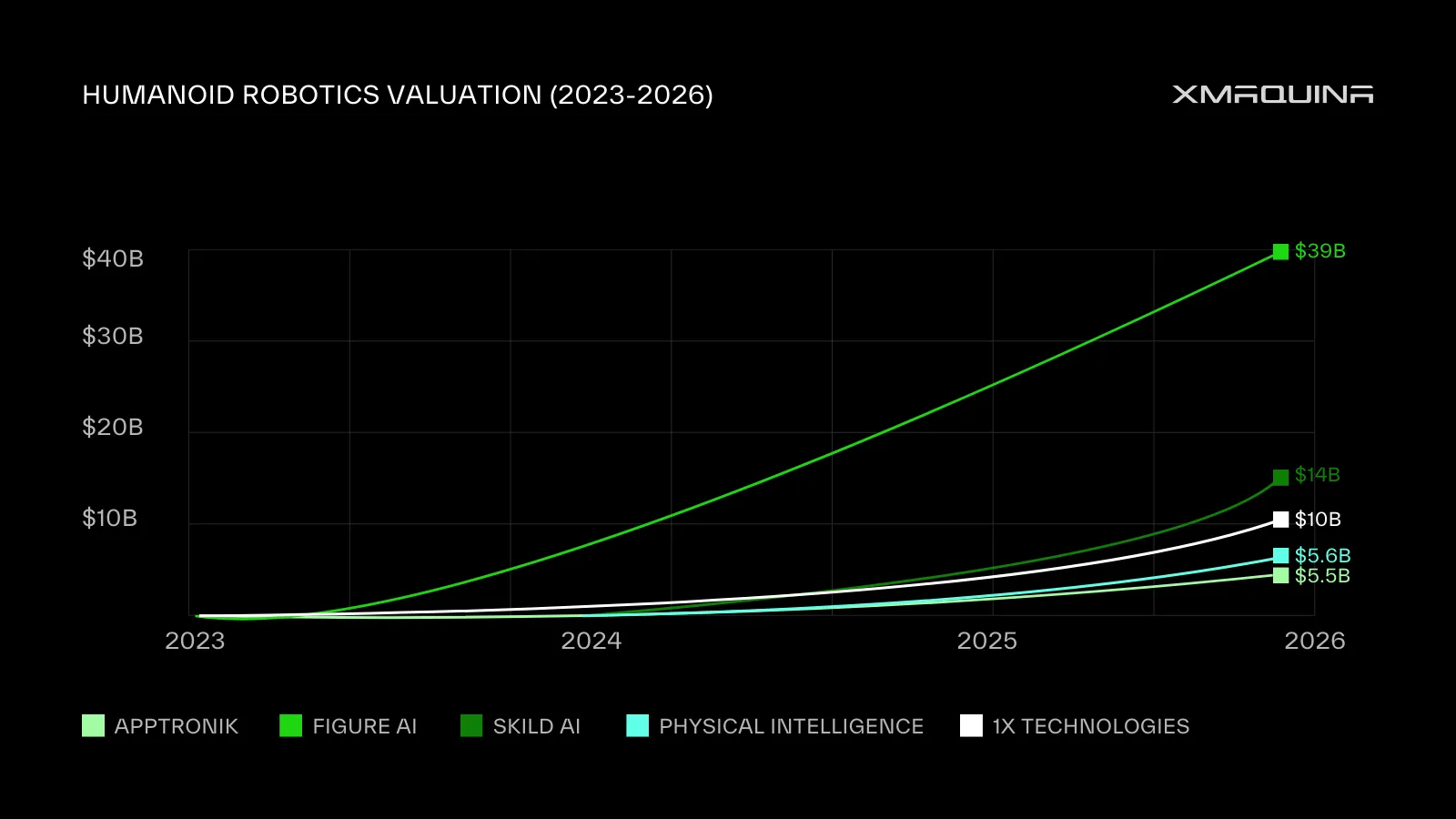 Figure AI grew from a $500M Series A in May 2023 to a $39B Series C by September 2025. Skild AI tripled its valuation in just seven months, reaching $14B by early 2026. Physical Intelligence hit $5.6B in under two years. Meanwhile, 1X Technologies signed a deal to deploy 10,000 humanoids by 2030.